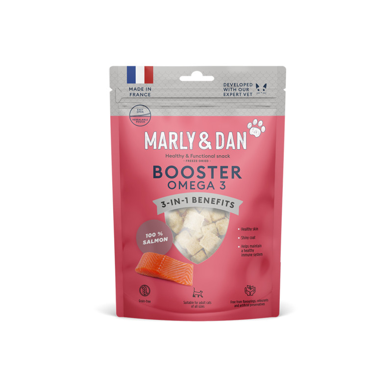 Made from 100% salmon and produced in France. Naturally rich in essential fatty acids, this snack helps maintain healthy skin and a glossy coat, while supporting a strong immune system.