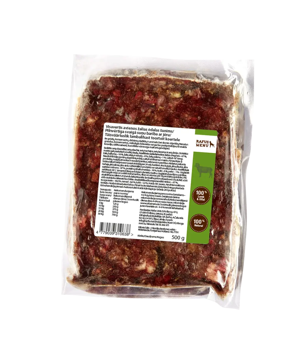 The recipe includes lamb stomach, lungs, trachea, bones, and liver for dietary variety and nutrient richness. Complete raw food for dogs with lamb.