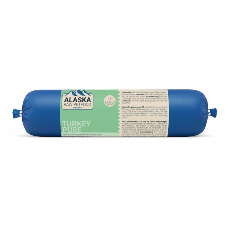 Alaska Cat Turkey 250g ir pilnvērtīga un sabalansēta jēlbarība kaķiem no svaigas tītaras gaļas. Nodrošina svarīgākos uzturvielu avotus kaķa veselībai un dzīvībai.