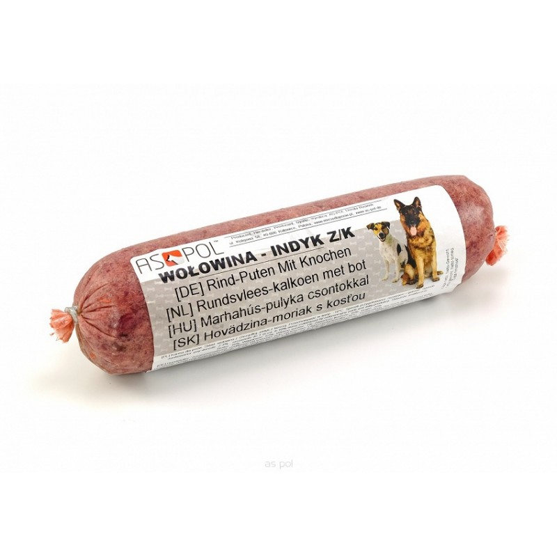 Aspol Jautiena un tītars ar kauliem – neapstrādāts barības produkts, kas apvieno svaigu jautienu, tītaru un dabiskos kaulus. Bagāts ar olbaltumvielām, tas veicina muskuļu attīstību, stiprus zobus un veselīgu gremošanu.