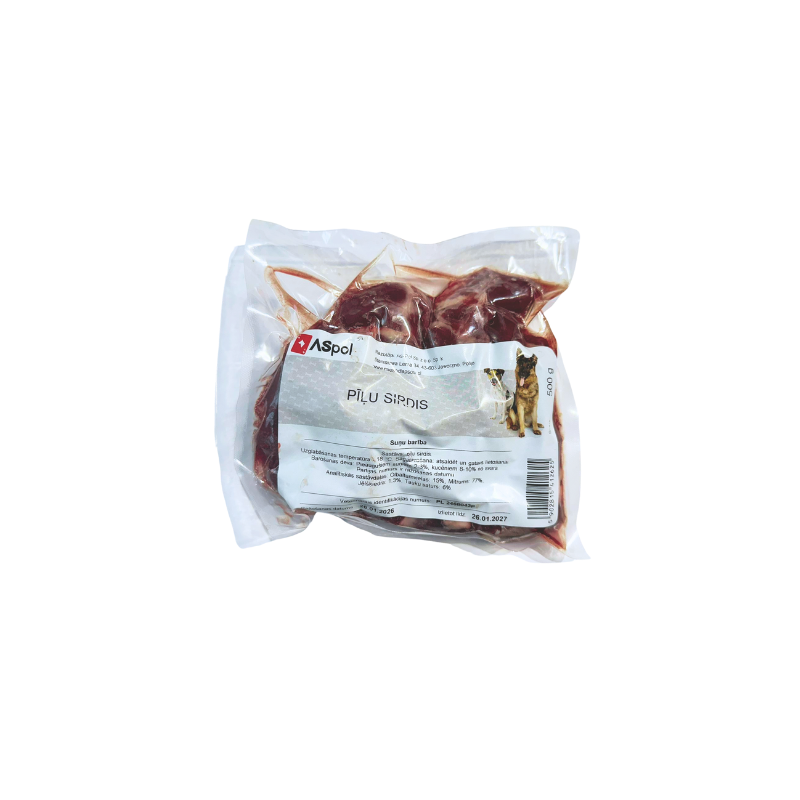 Aspol Pīļu Sirdis ir augstvērtīgs, viegli sagremojamu olbaltumvielu, neaizvietojamo aminoskābju un svarīgo B grupas vitamīnu avots. Šis uzturvielām bagātais produkts atbalsta sirds veselību, muskuļu darbību un stiprina imunitāti aktīviem suņiem.