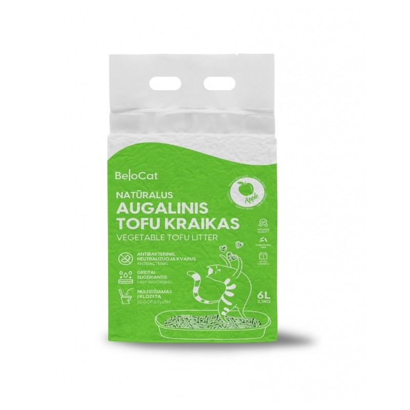 BeloCat Tofu aglomerējošās kaķu smiltis ar ābolu aromātu 6l ir dabīgs un efektīvs risinājums Tava mājdzīvnieka ikdienai. Tās izgatavotas no tofu un piesātinātas ar patīkamu ābolu aromātu.