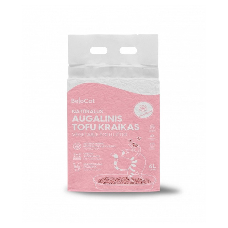 BeloCat Tofu aglomerējošās kaķu smiltis Cherry Blossom 6l apvieno augstas veiktspējas augu izcelsmes granulēto maisījumu ar vieglu ķiršu ziedu aromātu. Izgatavotas no kukurūzas cietes un sojas šķiedrām — tīra, droša un svaiga izvēle.
