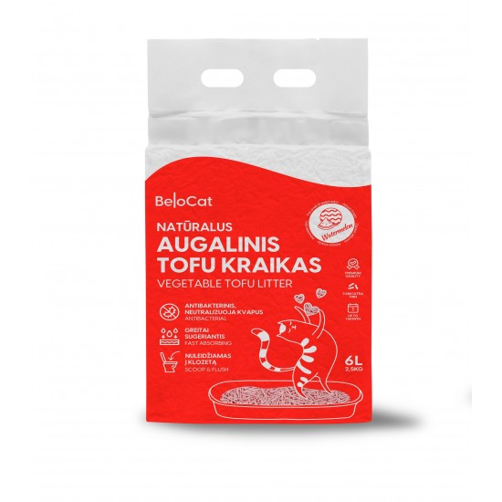 BeloCat Tofu aglomerējošās kaķu smiltis ar arbūza smaržu 6l ir dabīgas tofu smiltis ar papildinātu oglekļa formulu, kas nodrošina maksimālu smaku kontroli un higiēnu.