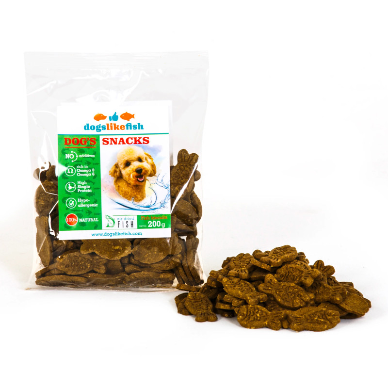 Šie biskvīti ir izgatavoti no kvalitatītas Baltijas zivju gaļas un augstas kvalitātes zirņu miltiem, lai sniegtu gardu garšu un vērtīgas uzturvielas. Biskvīti tiek ražoti Latvijā un ir piemēroti suņiem, kuri mīl zivju aromātu.