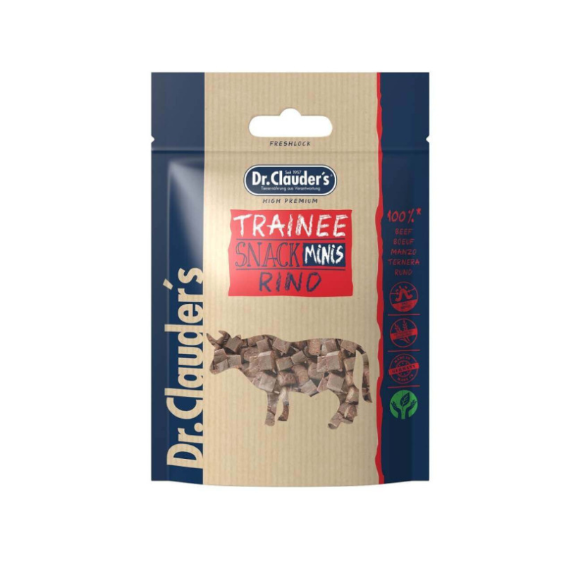Dr. Clauder’s Trainee Snack Minis Liellopu sastāv no 95% garšīgas liellopu gaļas. Pateicoties saudzīgajai tvaika žāvēšanai, gaļa saglabā savu unikālo aromātu. Ar FOS.