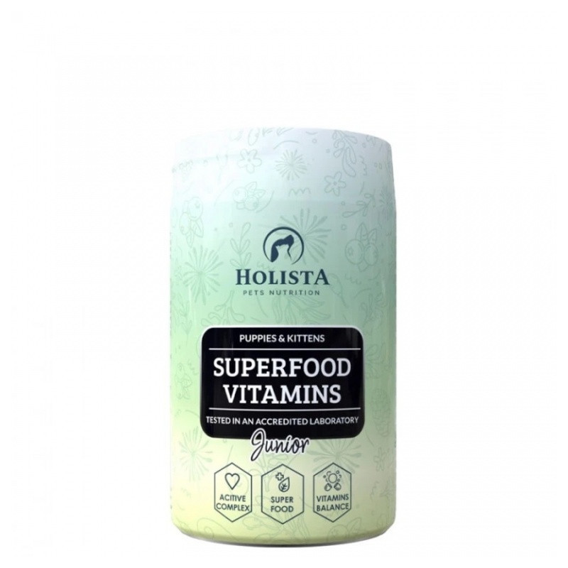 Superfood Vitamins Junior ir vitamīnu un minerālvielu piedeva, kas paredzēta kucēniem un kaķēniem līdz 12 mēnešu vecumam