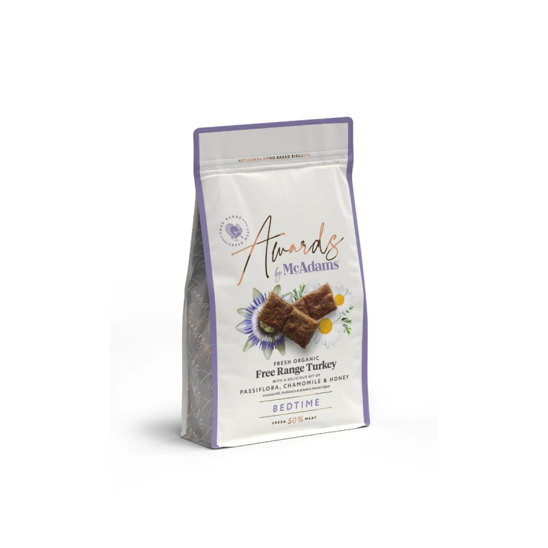 Šie maigi un barojoši gardumi ir gatavoti no brīvo audzēšanas apstākļu organiskas tītaru gaļas (50%) kā galvenās sastāvdaļas. Bagātīgo tītara gaļu papildina vitamīniem bagātie saldie kartupeļi, kokosriekstu eļļa veselīgam kažokam, prebiotikas vēdera veselībai, kā arī īpašas Atlantijas aļģes Ascophyllum nodosum mutes dobuma veselībai. Šos gardumus padara īpašus dabiskie nomierinošie komponenti — kumelītes, pasiflora un medus, kas palīdz sunim atslābināties pirms miega vai pēc stresainām situācijām. 150g