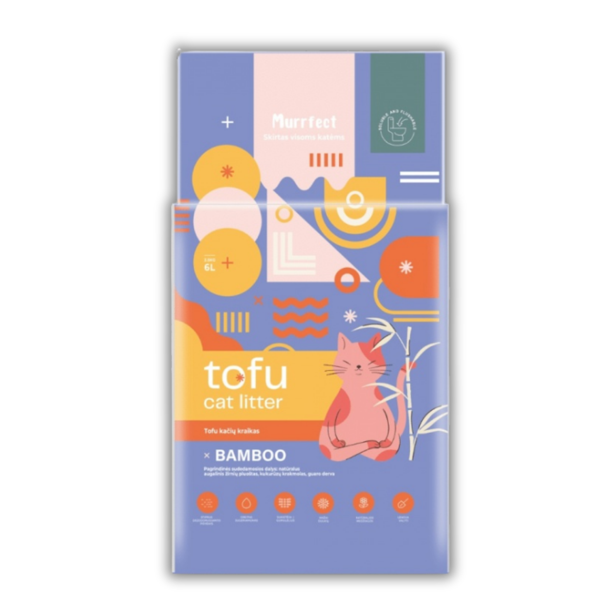 Murrfect Tofu Litter ir izgatavots no dabīgām sastāvdaļām, uzsūcas 5 reizes vairāk nekā citi pakaiši un uzreiz izšķīst ūdenī, padarot tos droši un viegli noskalojamus tualetē (lūdzu, neskalojiet pārāk daudz pakaišu vienlaikus).