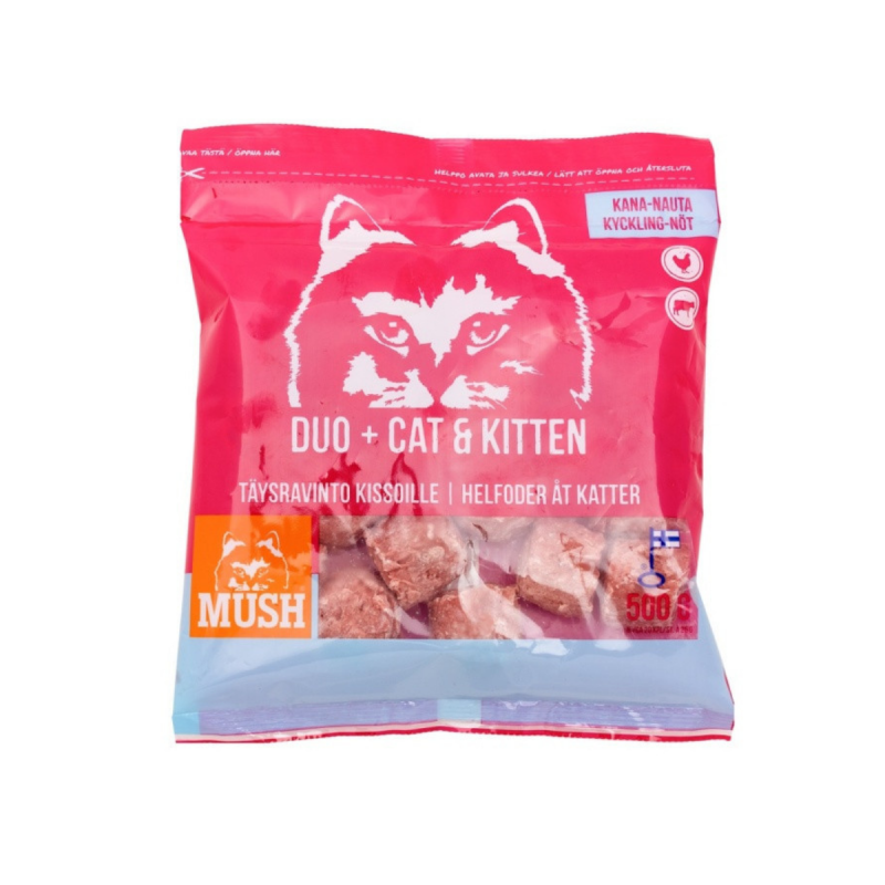 MUSH DUO+ CAT (vistas, liellopa gaļa) – Pilnvērtīga barība kaķiem, piemērota arī kaķēniem.