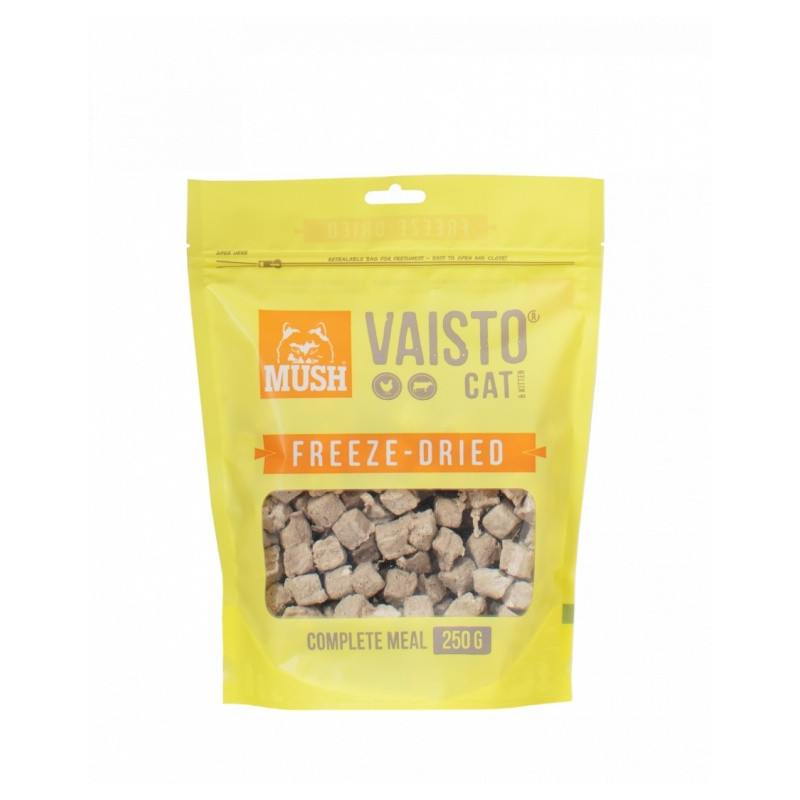 MUSH Vaisto Cat Yellow Freeze-Dried (vistas-liellopu gaļa) ir liofilizēta pilnvērtīga barība ar tādu pašu augstu uzturvērtību un kvalitāti kā parastai neapstrādātai barībai.
