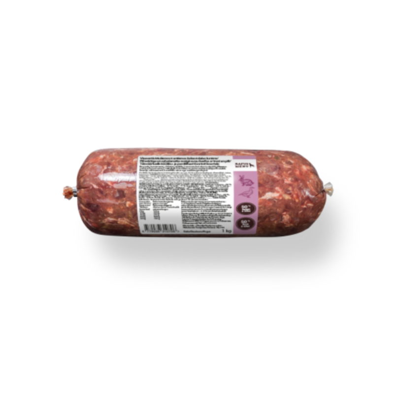 RAW suņu barība, kas sastāv no 50% trušu un 50% pīļu, bez graudiem, krāsvielām un konservantiem.