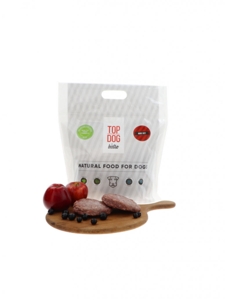 Viena burgera svars aptuveni ~ 160g (+ -5%) un tādējādi ir ideāli piemēroti gan lieliem, gan maziem suņiem. Burgeri ir iepakoti pa 10 gb. plastmasas iepakojumā, tāpēc jums būs ļoti ērti izņemt un atkausēt ikdienas porciju.