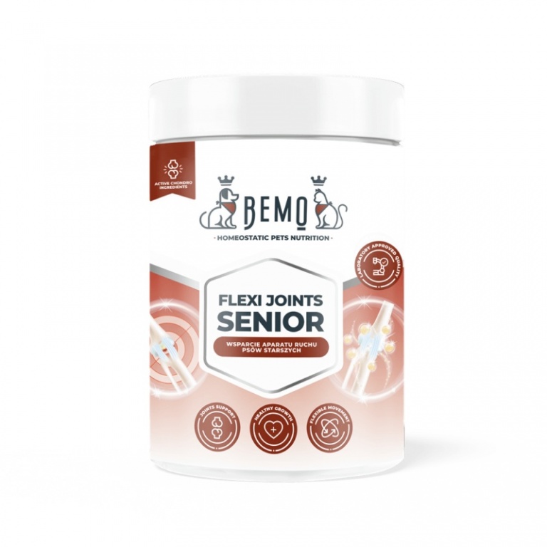 BEMO Flexi Joints Senior is a dietary supplement for older dogs (senior dogs), especially recommended for those requiring enhanced support of joint structure, mobility and movement comfort. The formula is developed with multiple active ingredients: type II collagen, glucosamine hydrochloride, chondroitin sulphate, hyaluronic acid, egg membrane, MSM (methylsulfonylmethane) and PEA (palmitoylethanolamide). These components help maintain cartilage elasticity, joint mobility and support the musculoskeletal system (joints, cartilage) for proper functioning.