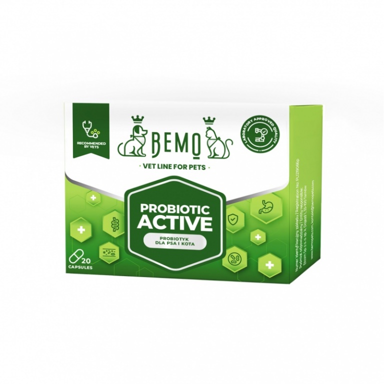 BEMO Probiotic Active is a perfectly composed probiotic preparation in a convenient capsule form, dedicated to dogs and cats for diet-preventive stabilization of intestinal microflora. The product provides active support for the digestive system during recovery, periods of reduced immunity, long-term feeding of highly processed diet or when changing feed. It is particularly recommended for dogs and cats with sensitive digestive systems who experience problems digesting or absorbing nutrients, manifested by poor stool consistency or unpleasant stool odour. Intended for all breeds of dogs and cats older than 4 weeks.