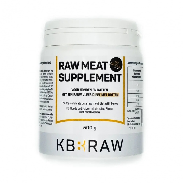 This Raw Meat Supplement without calcium is suitable for supplementing a raw meat diet for dogs, cats, and ferrets with bones. The supplement contains all the necessary vitamins and minerals according to European guidelines for dogs and cats.