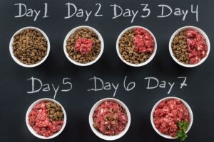 - 5-6 дни: Перейдите на 75% сырого корма, 25% сухого корма